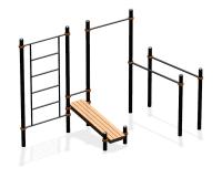 Конструкция состоит из шведской стенки, скамьи для укрепления мышц пресса, турника и брусьев. Все элементы выполнены из металла и покрыты порошковой краской.